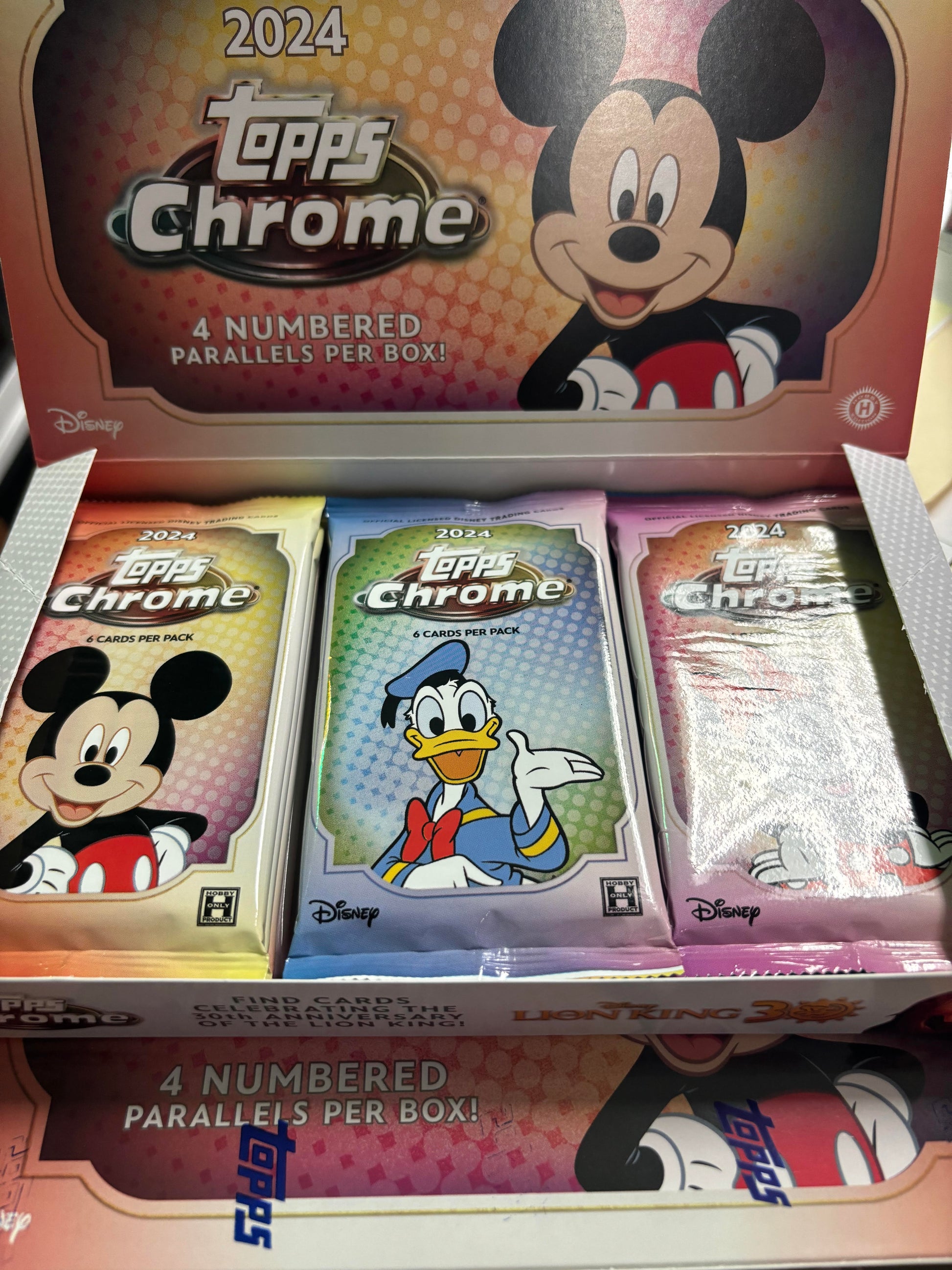 2024 Topps Chrome Disney Hobby Pack. New! Purchase is for one (1) factory sealed and randomly chosen pack from a 12 pack hobby box as shown. Each box has three characters as options. Mickey, Donald and Minnie. There are 6 cards per pack and 4 Numbered Parallels advertised per box.