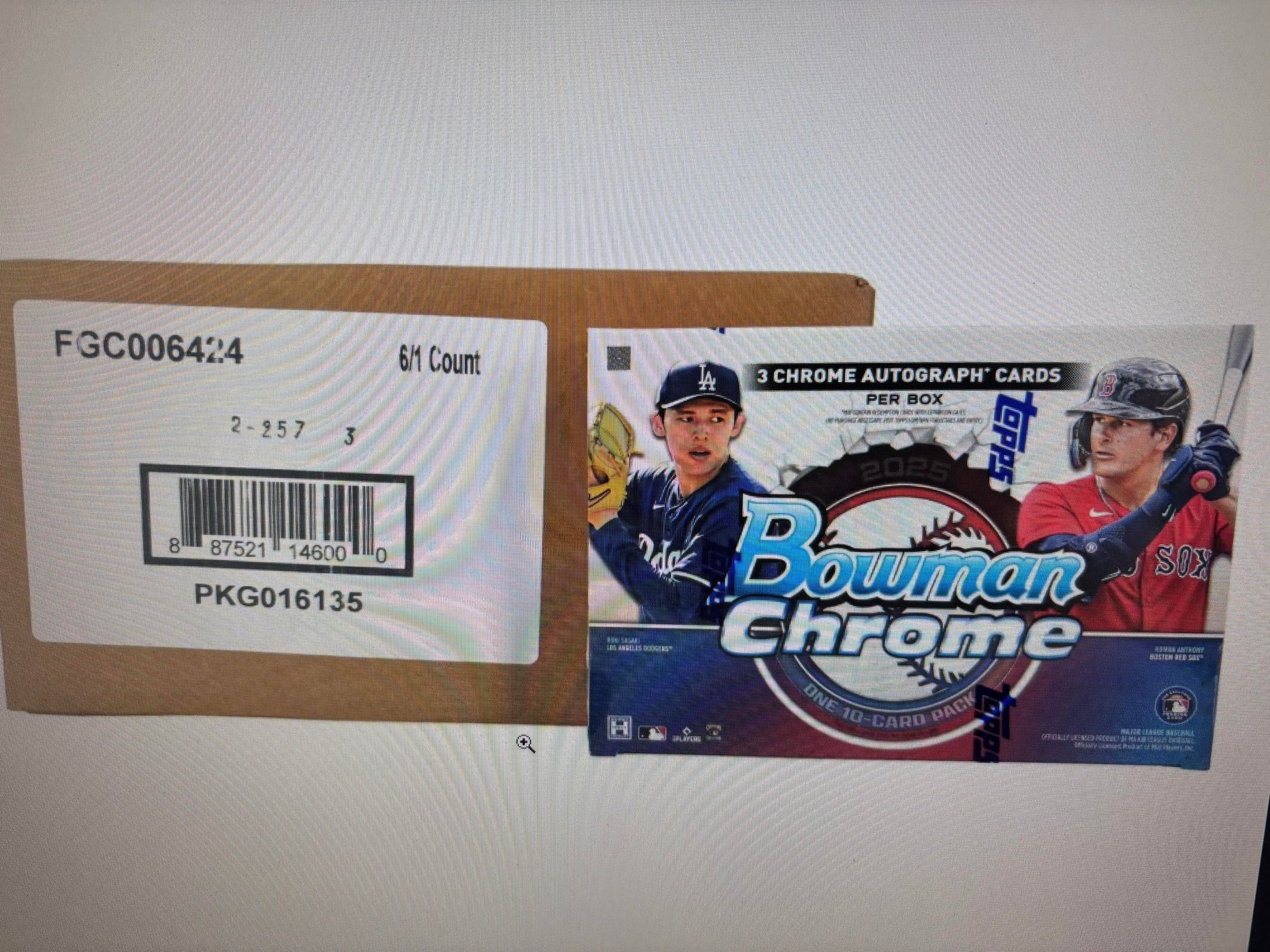 2025 Bowman Chrome MLB Hobby Breaker Delight Sealed Case. New. Sealed case consists of 6 Hobby Boxes, each with 3 autographs advertised.